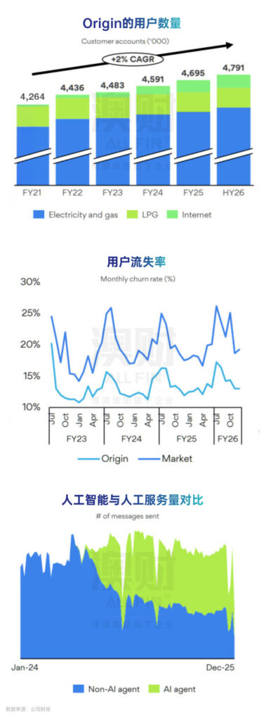 财务数据显示,HY26期间Origin总账户数净增9.6万个,总量攀升至479.1万。在衡量零售业务健康度的核心指标——客户流失率上,Origin仅为14.7%,远低于22.4%的行业平均水平。这一显著的利差不仅彰显了强大的品牌忠诚度,更深刻揭示了其科技平台与用户体验之间的协同效应。