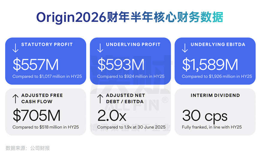 在2026财年上半年(HY26)的宏观背景下,Origin Energy(ASX:ORG)的业绩表现充分诠释了其在复杂周期波动中的战略定力。受全球大宗商品价格从历史极端高位回落的影响,天然气板块的账面利润不可避免地出现了结构性收缩,拖累集团法定净利润与EBITDA同比均录得超过4亿澳元的下滑。然而,这种表面的盈利波动并未动摇市场的投资信心。