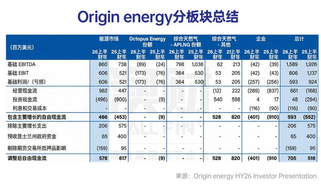 先看基本盘,Origin本质上是一家覆盖零售售电售气、综合天然气业务以及新型家庭能源服务的综合能源公司,当前盈利底盘仍主要来自传统业务。公司2025财年能源市场的Underlying EBITDA 为A$1.404bn;2026上半财年为A$860m;预计全年有望增长到A$1.55bn–A$1.75bn。这意味着,市场今天对Origin的主要理解,仍然建立在传统零售能源与气相关业务之上。