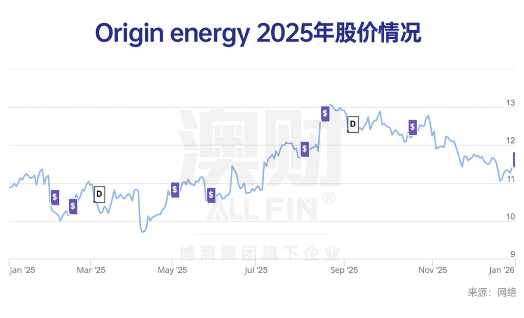 股价表现也可以验证这一点。根据澳洲市场公开历史价格汇总,Origin在2025年的价格区间大致为$8.62–$13.13,年末约$11.49;进入2026以来,区间大致为$10.61–$13.13,最新价约 $12.53,财年至今涨幅约 15.9%。市场交易它的核心仍围绕零售盈利前景改善和传统能源业务盈利韧性展开。