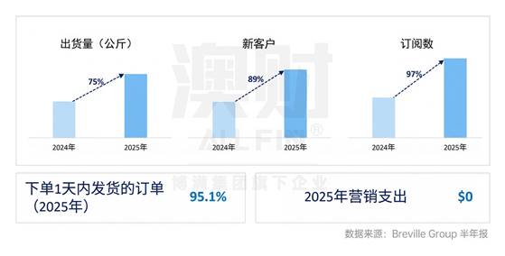在这份半年报里,Beanz 的表现几乎可以用“悄悄爆发”来形容——咖啡豆发货量同比增长 75%,新客户增长 89%,订阅用户增长 97%。更令人意外的是:营销支出为零。这意味着,这项业务并非依赖高额获客成本驱动,而是在既有用户基础上自然扩张。