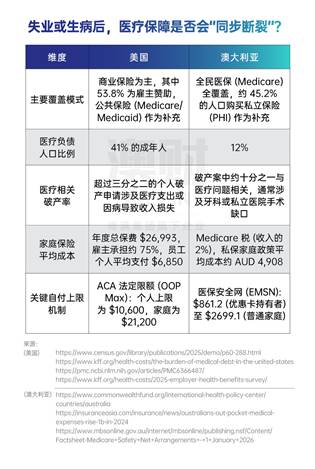 澳洲的底层逻辑不同。Medicare 是全民覆盖体系,个人是否有工作并不决定你“有没有资格看病”。当然,澳洲并不是“零成本”:数据显示,2023–24 财年非政府来源占医疗总支出 30.4%,其中个人支付额约 440亿澳元;但关键在于,它有安全网机制:2026 年 Medicare 安全网门槛大致为普通家庭 2699澳元、优惠卡/低收入家庭约 861澳元,达到阈值后报销比例会显著提高。也正因为有这种“上限”设计,澳洲报告因医疗开支负债的人群比例约 12%,明显低于美国。