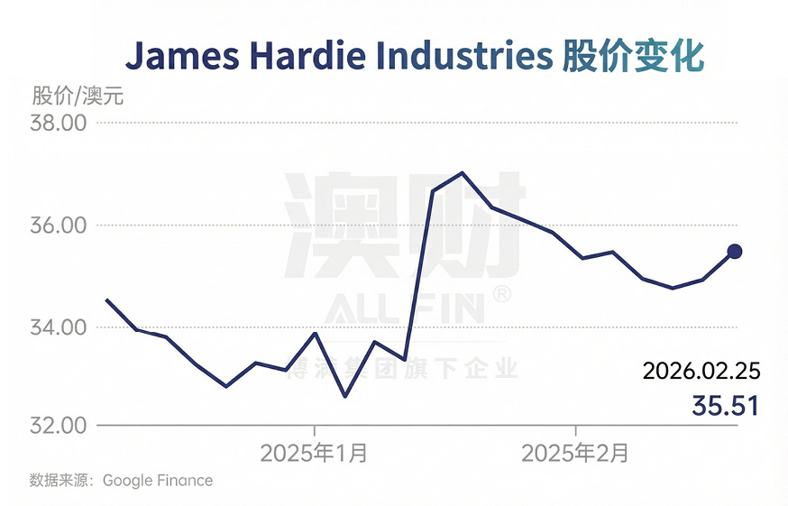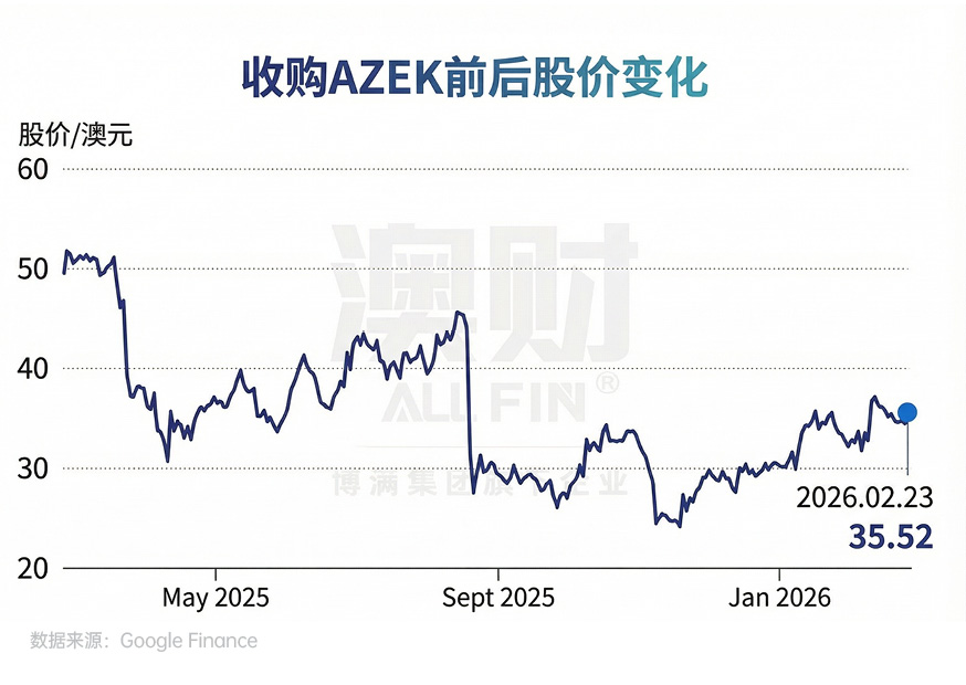 2025年3月,James Hardie以87.5亿美元完成对AZEK的收购,溢价约26%。这笔公司史上最大规模的交易,将纤维水泥外墙板龙头推向“户外生活整体解决方案”的新赛道。然而交易落定后,北美住宅需求迅速转弱,渠道去库存压力加剧,公司北美内生销售明显下滑,股价一度跌至25美元附近,市场对高溢价并购的质疑一度盖过战略愿景。