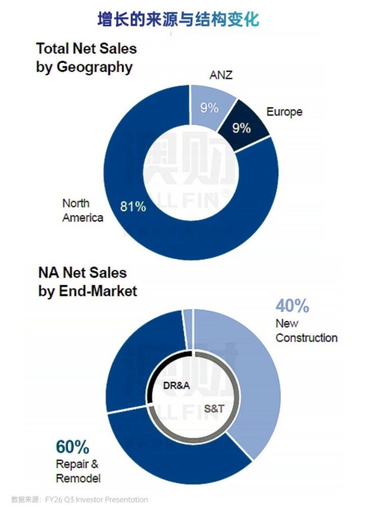 从地域看,公司收入高度集中,北美贡献约81%,欧洲与澳新(ANZ)各占9%,本质上仍是一家高度依赖北美住宅周期的企业。在北美收入中,约60%来自维修与翻新,40%来自新建住宅。新建需求对利率敏感,而翻新更多受房价财富效应与存量房老化驱动,波动相对缓和,在新屋开工持续疲弱的背景下,翻新市场成为重要稳定器。