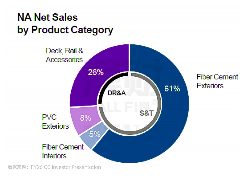 从收入结构看,北美收入结构呈现明显转型分化。护墙板与装饰件(S&T)仍占北美收入74%,其中纤维水泥外墙产品贡献61%;露台、围栏及附件(DR&A)占比26%,已成为第二增长曲线。本季度S&T净销售额约7.88亿美元,同比增长10%,其中8100万美元来自AZEK外墙并表。若剔除并购因素,内生收入下降约2%。销量整体下滑7%,单户住宅外墙(尤其南部市场)表现疲弱,多户住宅增长有限,室内产品需求双位数回落。