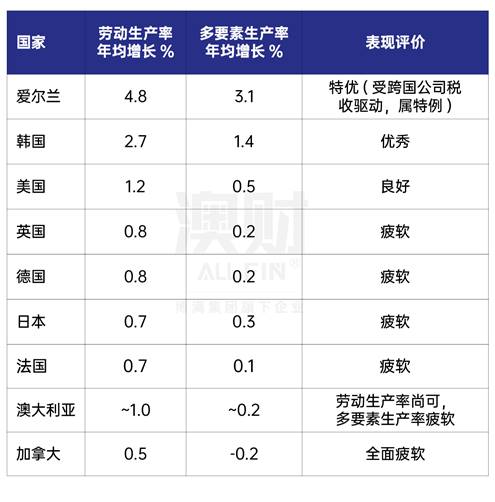 过去五年,澳洲多要素生产率的年均增速仅 0.46%,劳动生产率年均 0.68%。这在发达经济体中属于低位,仅略高于加拿大,远低于韩国等创新驱动型国家。