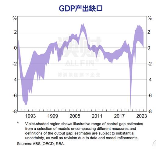 但如今,澳洲的GDP产出已经接近“满负荷”(图表中2023年后,产出缺口估计值已非常接近甚至达到0%,印证了这一点)。