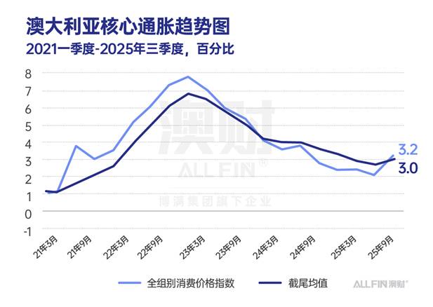 截至2025年9月季度,澳大利亚CPI同比上涨 3.2%,剔除波动项后的核心通胀为 3.0%——这是自2022年底以来的首次回升。