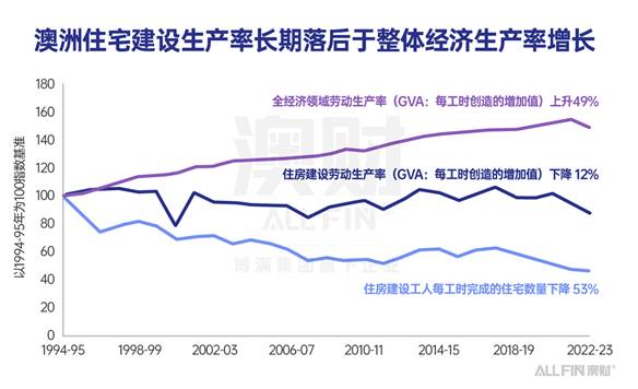 这是一组触目惊心的对比:自1990年代中期以来,澳大利亚整体经济的劳动生产率提升了近一半(49%),而衡量建筑业核心效率的指标——每个工人每小时能建成的住房数量——却暴跌了53%。这意味着,如今一个建筑工人工作一小时的实际产出,还不到三十年前的一半。