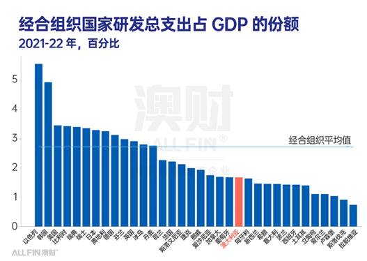 最新数据显示,澳大利亚的研发总支出仅占国内生产总值的1.68%,在经济合作与发展组织(OECD)的34个成员国中排名第22位。明显落后于OECD国家2.7%的平均水平。