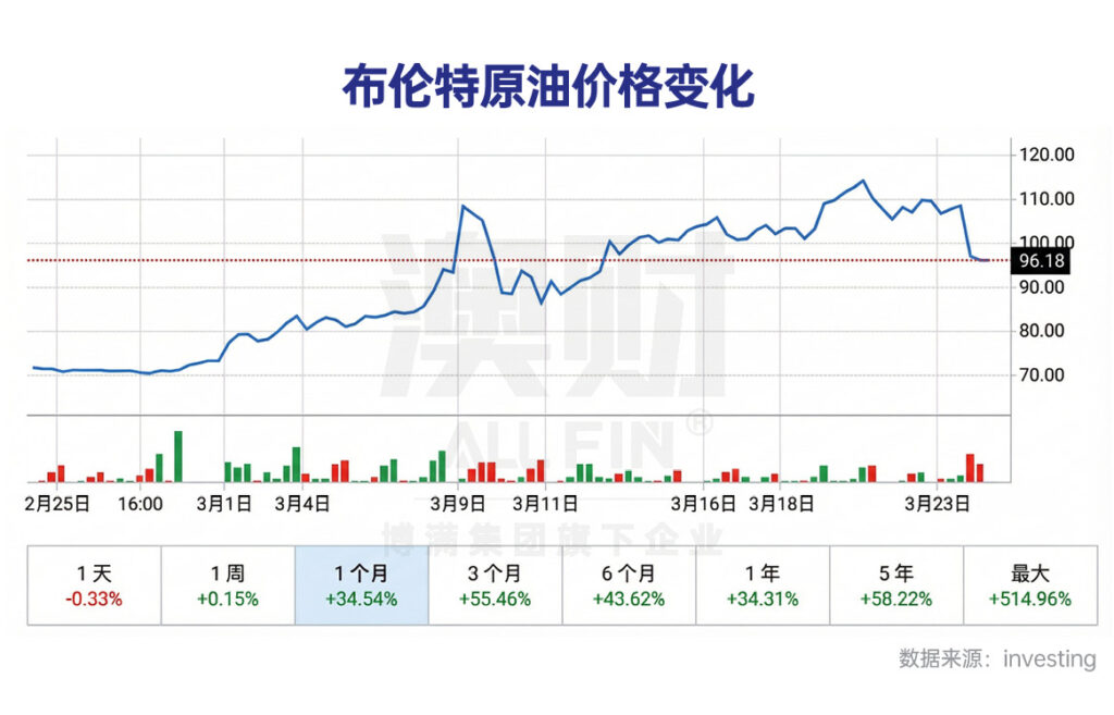 3月9日前后,布伦特原油价格自2022年以来首次突破每桶100美元,单日最大涨幅超过22%。而在战争爆发前,国际原油价格仍维持在每桶60美元左右的水平。
