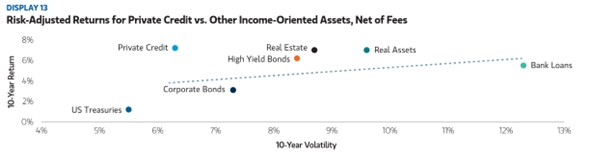 Private credit is explicitly recognized as a higher-risk, illiquid asset class. Yields reflect credit risk, illiquidity premium and structural complexity. Over the past decade, it has delivered higher returns than high-yield bonds, corporate debt and even real estate, often with comparable or lower volatility, indicating stronger risk-adjusted performance.