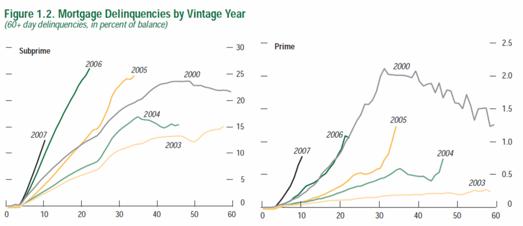 The data makes this clear. The subprime crisis did not unfold all at once, it began with the weakest credits and spread outward. Default rates on subprime mortgages originated in 2006 and 2007 rose sharply to above 20%, while prime mortgage delinquencies remained comparatively contained.